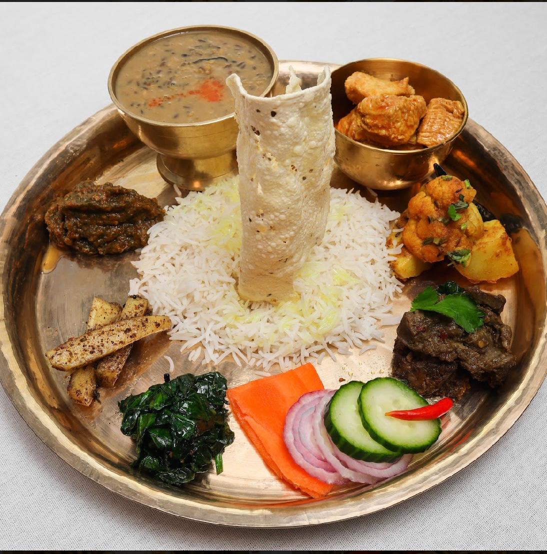 The Nepali Thali is a traditional meal that represents the rich culinary diversity of Nepal, often enjoyed as a complete and balanced meal. A typical Nepali Thali is served on a large metal plate, with various dishes arranged around a central portion of steamed rice (bhat).he Thali reflects the agricultural bounty and cultural practices of different regions in Nepal, offering a variety of flavors—from spicy and tangy to mild and savory. Historically, the Thali has been a staple in Nepali households, providing nourishment and satisfaction with its thoughtful balance of nutrients and taste. Today, it remains a beloved meal, symbolizing hospitality and the richness of Nepali cuisine.